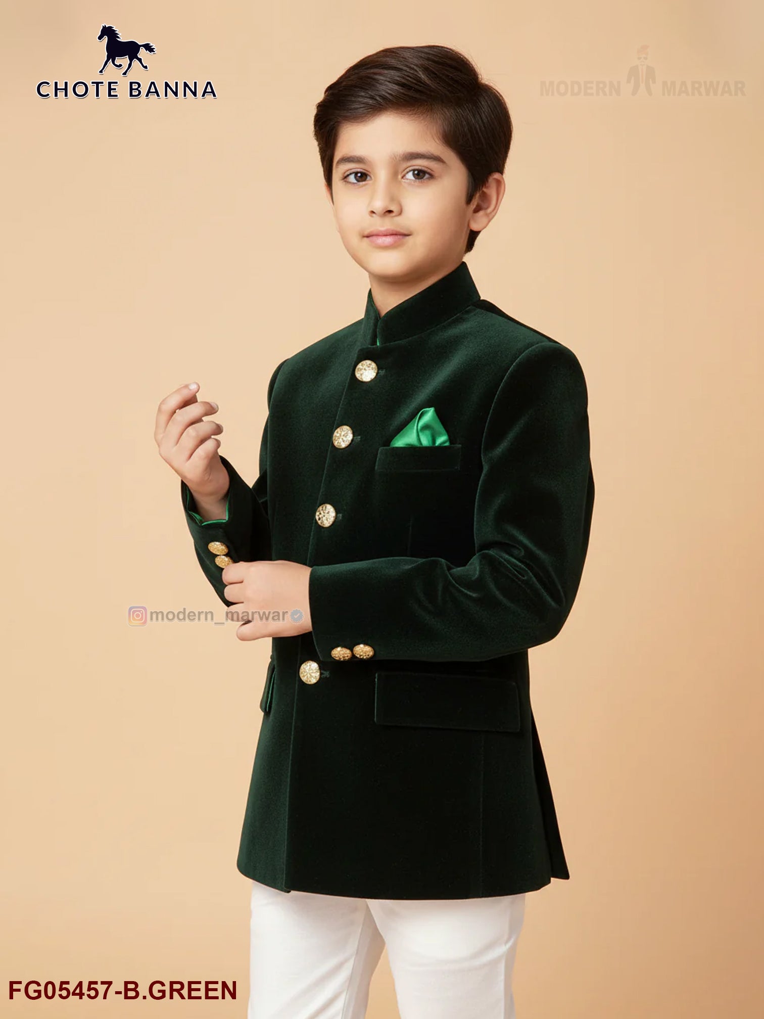 મોર્ડન મારવાડ ખાતે ઉપલબ્ધ CHOTTE BANNA ના અમારા બાળકોના વેલ્વેટ જોધપુરી સુટ્સ સાથે ભવ્યતામાં પ્રવેશ કરો. નાના બાળકો માટે તૈયાર કરાયેલા, આ સુટ્સ લગ્ન, ઉત્સવના પ્રસંગો અને કૌટુંબિક મેળાવડા માટે યોગ્ય છે.