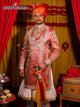 इस शेरवानी का हर विवरण शिल्प कौशल और गुणवत्ता की बात करता है। जटिल कढ़ाई इसके सौंदर्य को बढ़ाती है, जो इसे उन लोगों के लिए आदर्श बनाती है जो कुछ अनोखा चाहते हैं। समृद्ध कपड़ा खूबसूरती से लपेटा जाता है, जो एक शाही रूप प्रदान करता है।