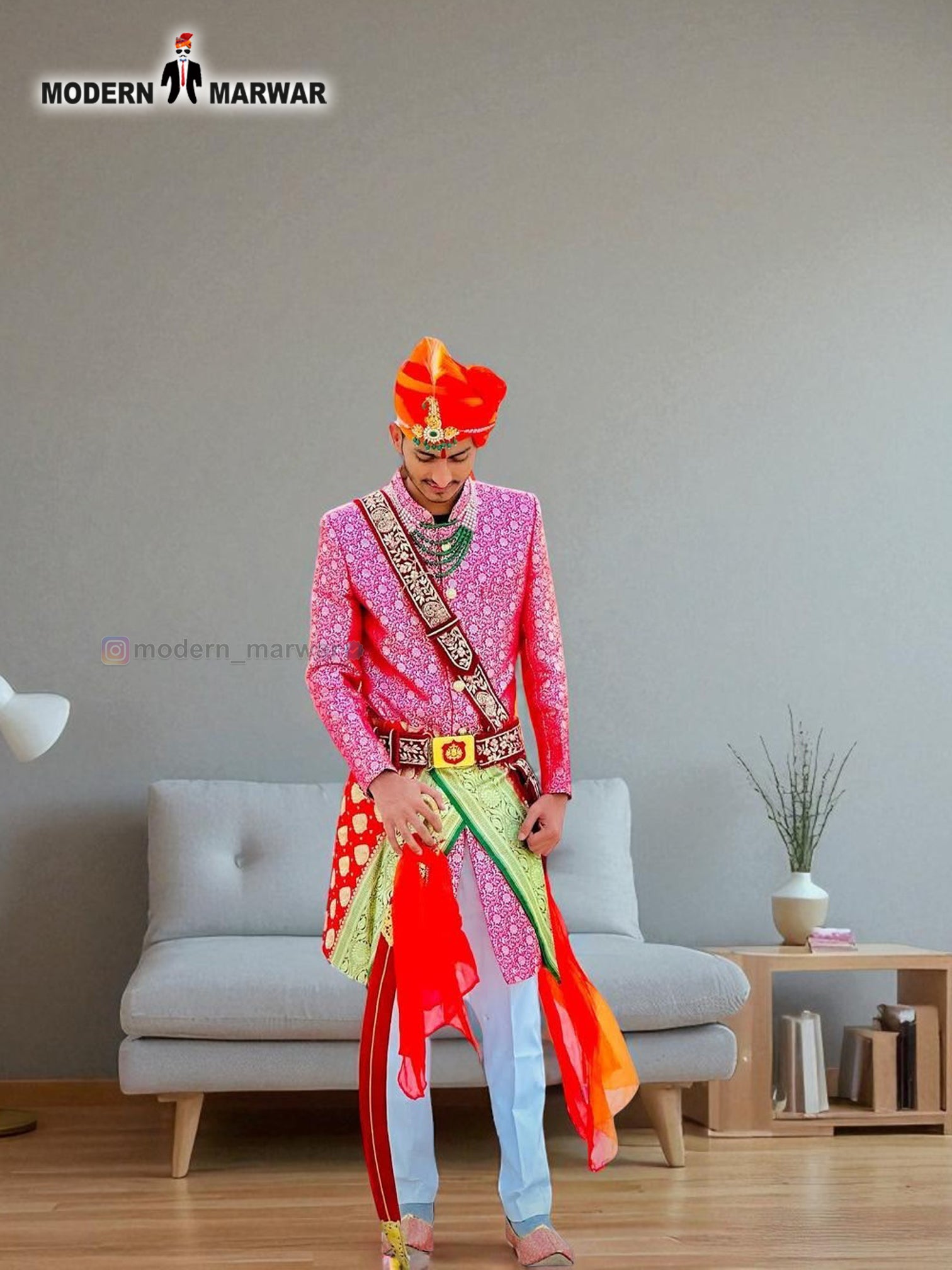 Stylish traditional Indian wedding sherwani in vibrant colors with intricate designs and festive accessories