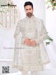 इस शेरवानी का हर विवरण शिल्प कौशल और गुणवत्ता की बात करता है। जटिल कढ़ाई इसके सौंदर्य को बढ़ाती है, जो इसे उन लोगों के लिए आदर्श बनाती है जो कुछ अनोखा चाहते हैं। समृद्ध कपड़ा खूबसूरती से लपेटा जाता है, जो एक शाही रूप प्रदान करता है।