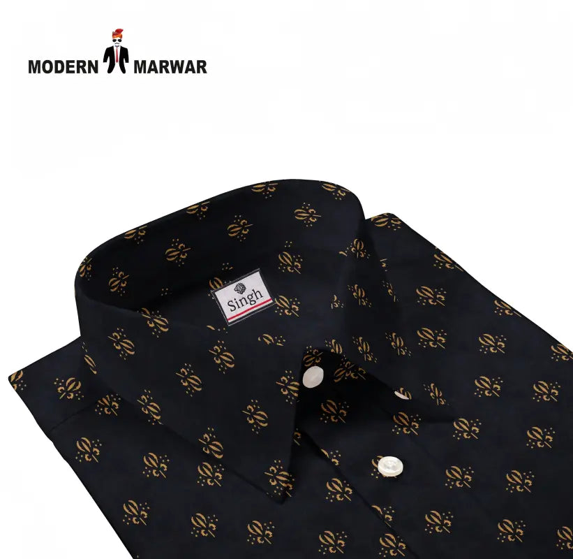 Stylish black premium men's shirt online with intricate pattern and button-down collar
